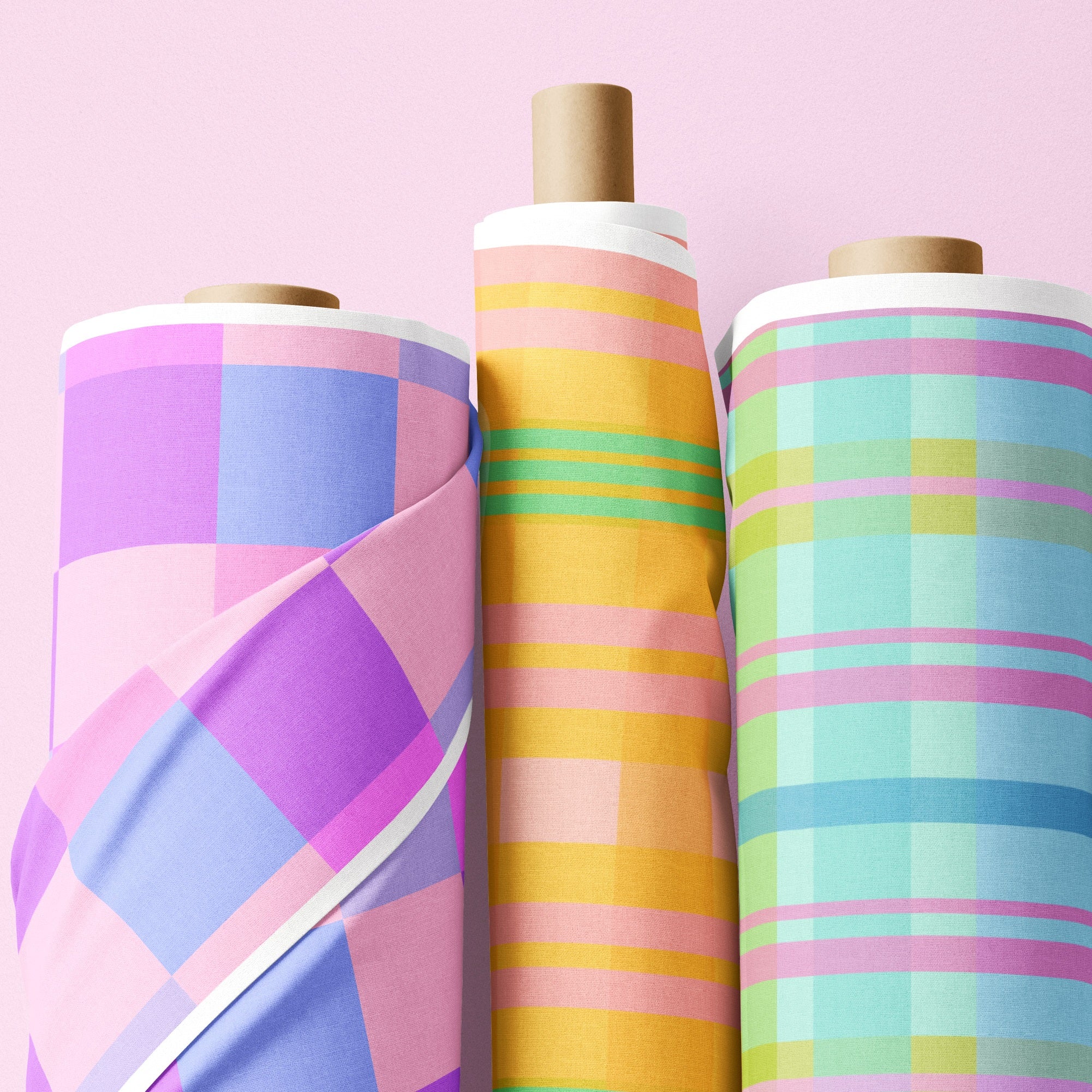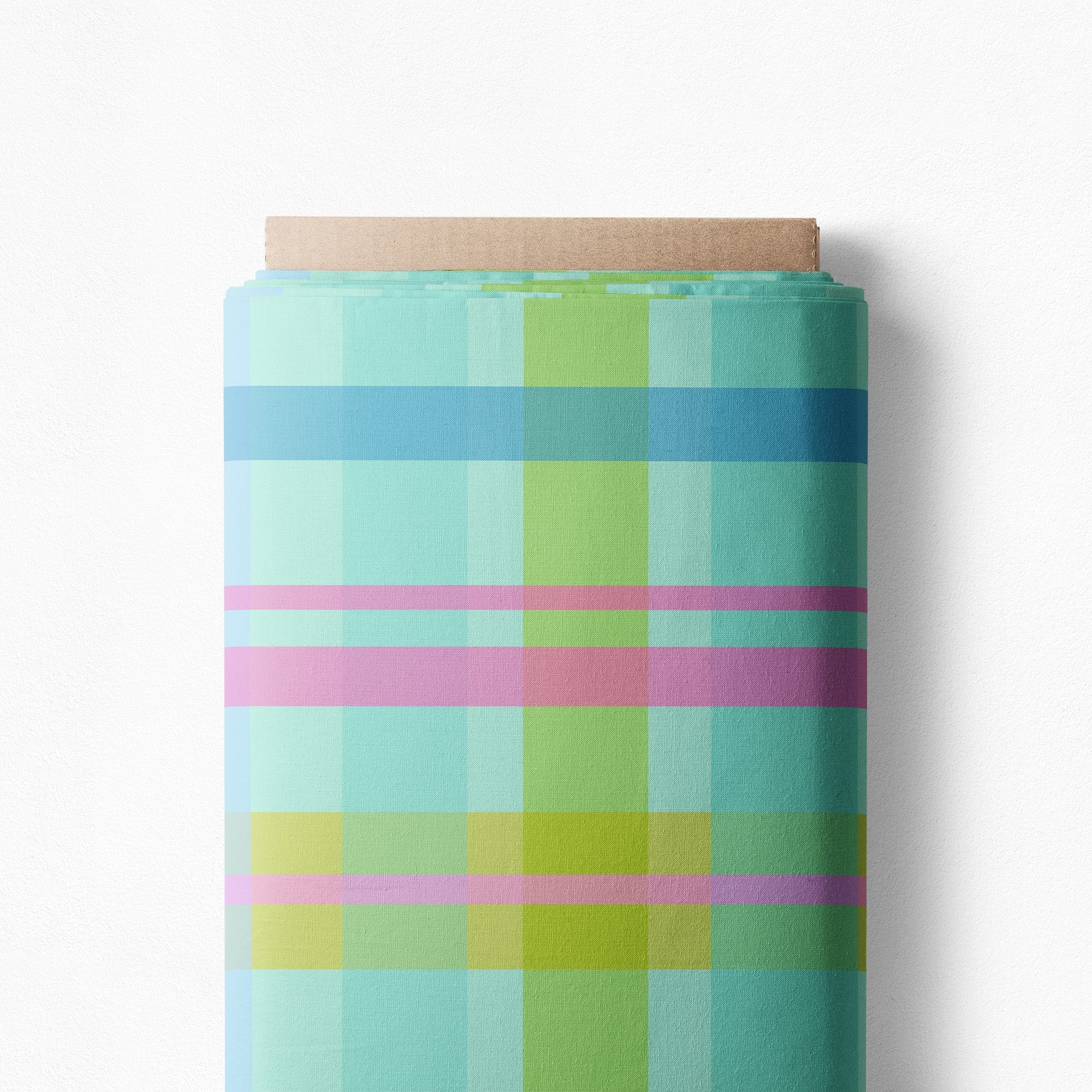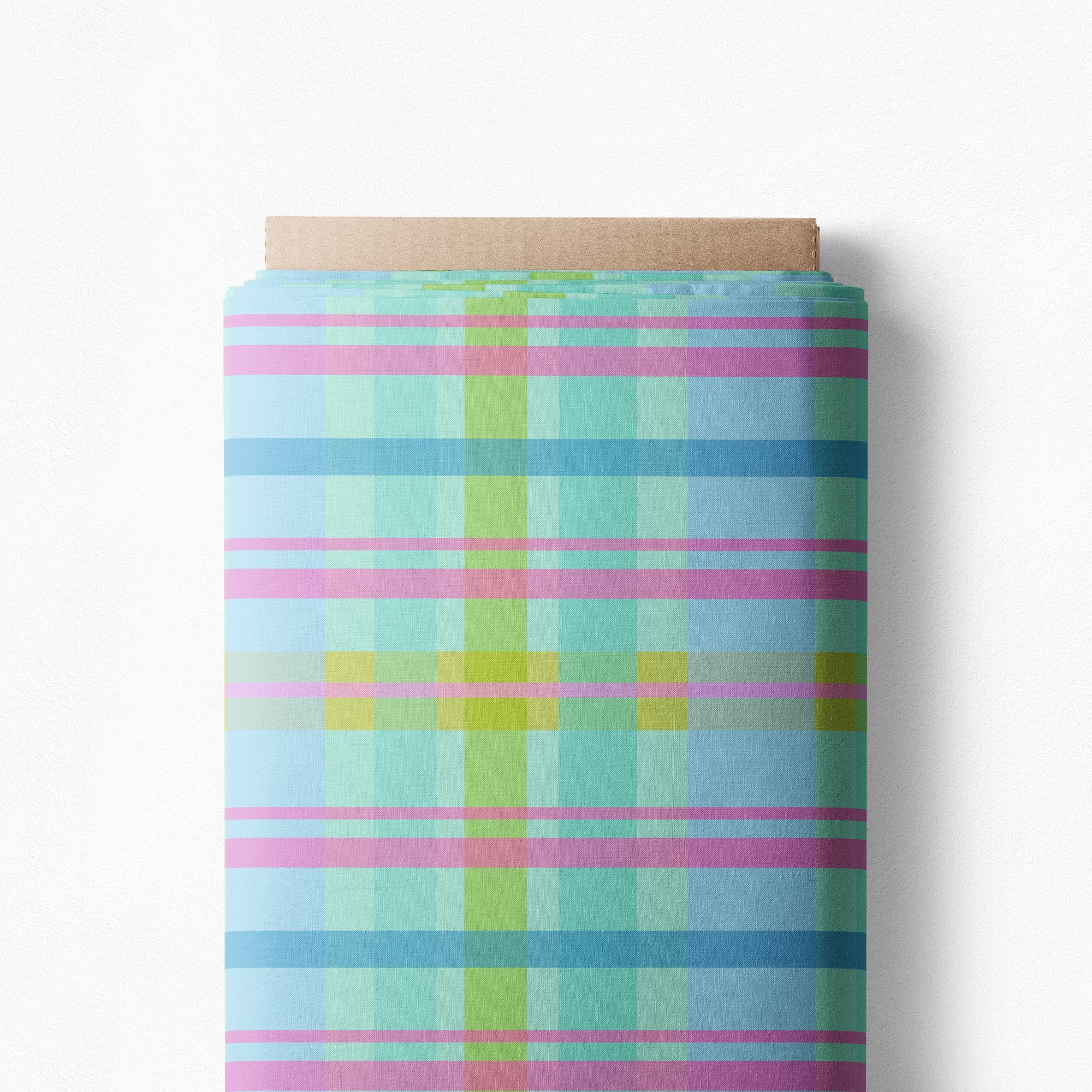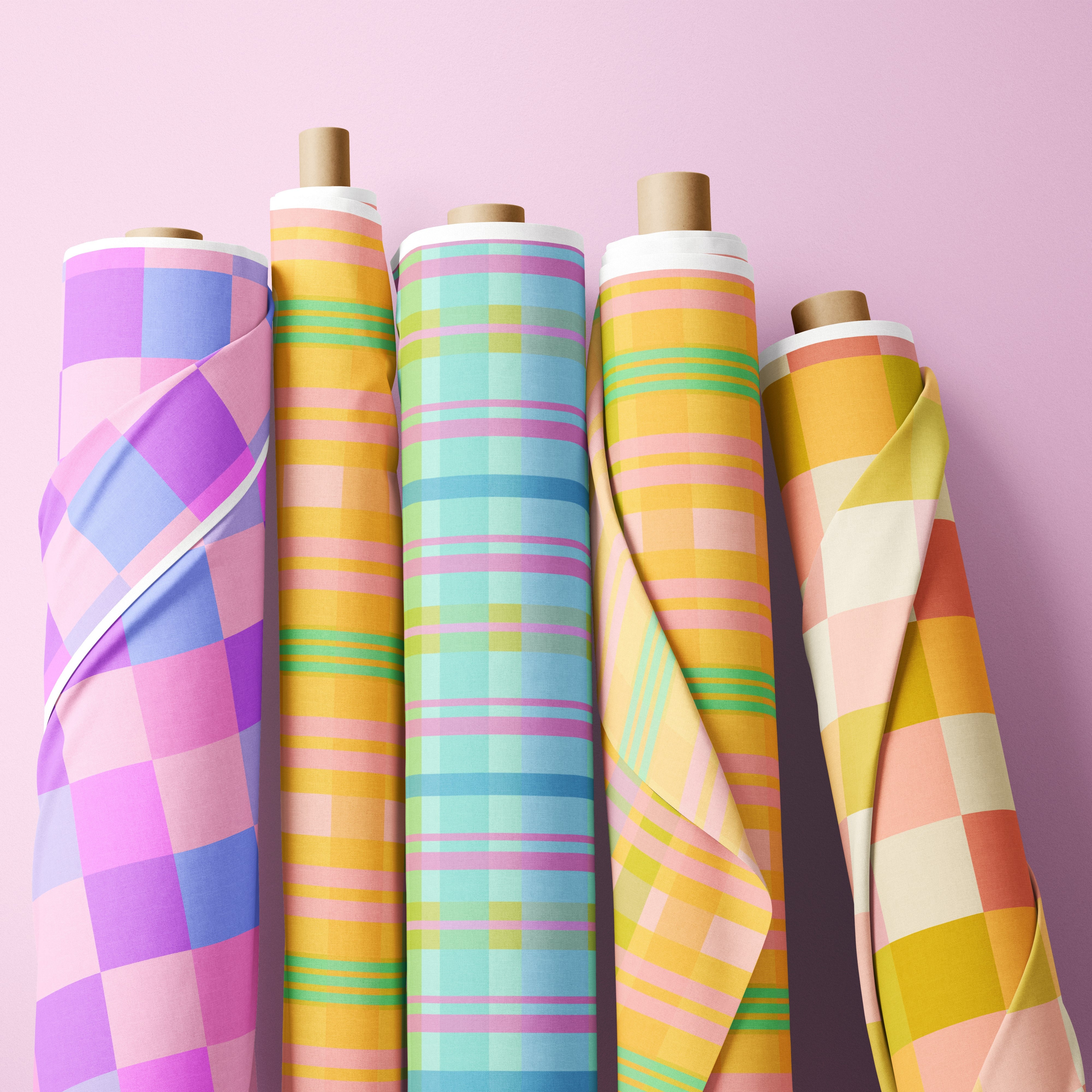 The first of our in-house designed plaid prints with absolutely delicious soft blues and greens mixed with a crossing of happy pink! Linen cotton and light apparel await!